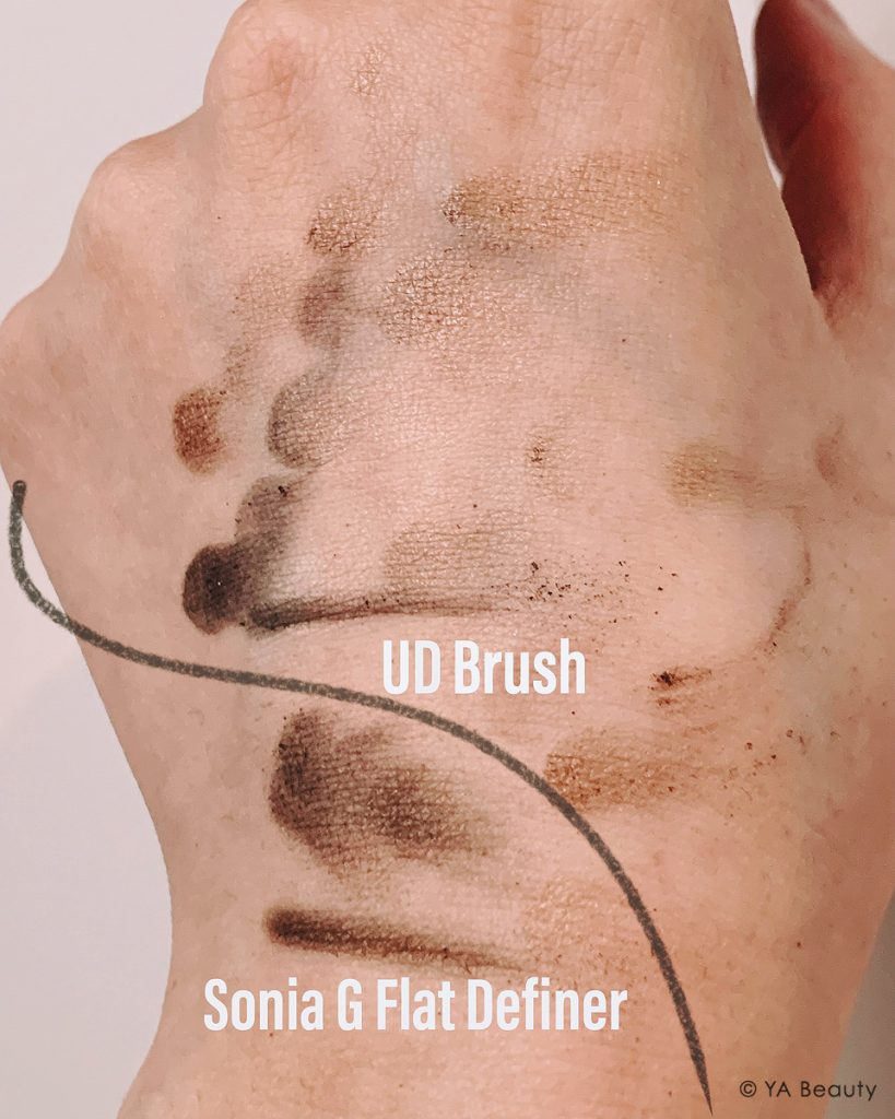 You can see the eyeshadow powder kicked up in a halo around where Urban Decay brush was used here, while around the Sonia G Builder Pro it had minimal fallout.
